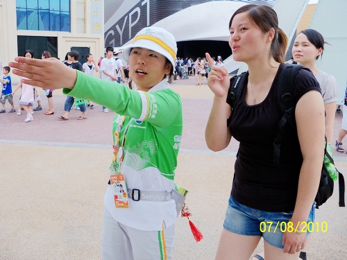 最辛苦的位置当属6号出口处的一号伞位置。人流量大的时候,就算是两个志愿者也应付不暇。这对我们来说又是一个考验,这要求我们必须对各条路线和场馆有非常熟悉的了解,才能快速地解决游客们的问题。而在世博轴里面,最重要的是熟悉世博轴中各个商铺的位置,游客们大多询问的便是这一类的问题。