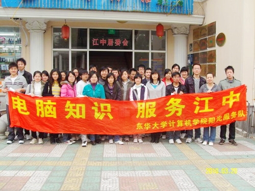 2010年3月20日,东华大学计算机科学与技术学院阳光服务队的29名同学在指导老师郭茜的带领下走进松江区江中社区面向全体居民开展了一次关于电脑保养与维护的大型问卷调查活动。此次活动的目的是了解居民在电脑维护方面所需要的服务,以便我们能在以后的活动中能更贴实际的向居民提供电脑维护方面的服务,用自身所学的专业知识更好的服务他人,同时也为世博会的到来做出贡献。