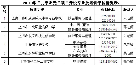 2010年“共享阳光”中专班——来沪务工人员子女教育就业援助行动开始招生。即日起至2010年1月底,父母一方为来沪务工人员,有上海市临时居住证或居住证,在上海工作满一年以上、年龄17-22周岁,有临时居住证、初中学历、家庭困难、身体健康的无业(失业)青年都可报名参加。