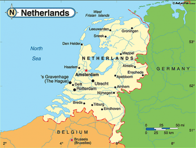 (荷兰主要城市与河流的相对位置图。来源:Maps.com)