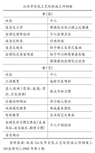 除这些慈善组织或机构关注于教养者公民意识的培养之外,其他机构也积极赞同在社会上进行公民素养的教育。有的报馆甚至设立临时办事处,特增设成年识字班及妇女识字班,解决社会文盲问题。这些班除教授识字等课目外,还设有妇女班加授看护家事常识,成年班加授公民常识。用民间募捐的善款所创办的教会学校,创办了不少的慈善学堂,这些学堂不仅对贫民子弟上学给予免费扶助,而且重视受教育者的公民素养的培养。西安基督教所创办的培德小学明确提出,其教学内容除按政府规定章程办理外,还确定有三门选修课,“一系英文,一系宗教教育,一系公民课”。这三门课中,宗教教育课凸显了该校为教会学校,但公民课的开设表现了教会学校对培养者公民意识知识的注重。汕头市贫民工艺院的工作纲要也展现了对收养者进行公民教养的理念。纲要一方面注重对贫民的“养”,但更注重“教”,尤其是努力培养贫民为一名所谓基本的公民(具体见下表),更授之以国歌激起其爱国之心。