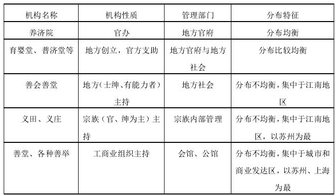清代各地的慈善机构名目繁多,比较常见的有官办的养济院、栖流所(又称流养局、留养所)、惠民药局、漏泽园;地方创立、官方支助的普济堂、育婴堂;地方社会管理的同善会、清节堂等善会善堂;宗族内部管理的义田义庄等。除这些日常救助机构外,清政府也十分重视灾害救助,建立了比较有效的报灾、勘灾、救灾程序,并日益完善仓储制度。当灾难发生后,会采取蠲免、调粟、借贷、施粥、散米等灾害赈济措施。