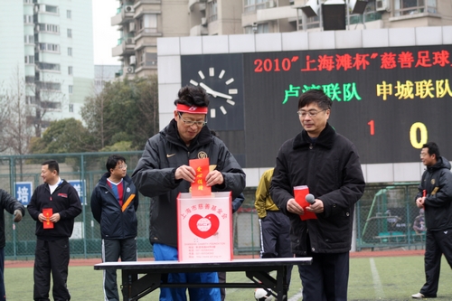 体育场上空,鲜艳的五星红旗伴随着《爱的奉献》悠扬的旋律,迎风飘扬,上海市慈善基金会卢湾区分会会长苏秉公、副区长江小龙,原申花足球俱乐部成员成耀东、朱琪,区机关足球爱好者,保乐力加、九城置业等企业踊跃捐款,纷纷向贫困儿童表达一份爱心,送上一句祝福!现场共捐款3000余元。