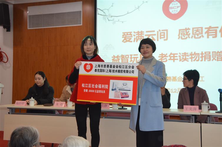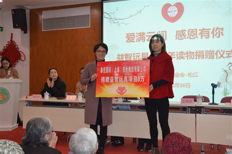 上海慈善网讯 12月25日上午,上海市慈善基金会·松江在松江社会福利院举行“爱满云间、感恩有你”——益智玩具、老年读物捐赠仪式”。泰克国际(上海)技术橡胶有限公司、上海钟书实业有限公司分别向上海市慈善基金会·松江捐赠价值八万元的老年益智玩具、120本老年读物。这些精神食粮将惠及20家养老机构、3501名入住老人。