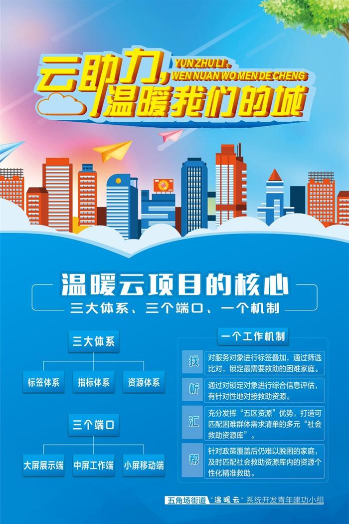 便捷操作的背后,是工作量巨大的“数据基底”建设。五角场街道团区委的“温暖云”系统开发青年建功小组,是一支平均年龄28岁的年轻人组成的7人工作组。“温暖云”系统项目提出伊始,青年建功小组就积极联动各职能科室开展前期调研,梳理整合帮困政策及相关资源,了解困难人群的实际情况,助力“温暖云”精准救助应用场景开发建设。他们还走进互联网企业,了解前沿技术发展方向,为项目数字化运用“把好脉”。