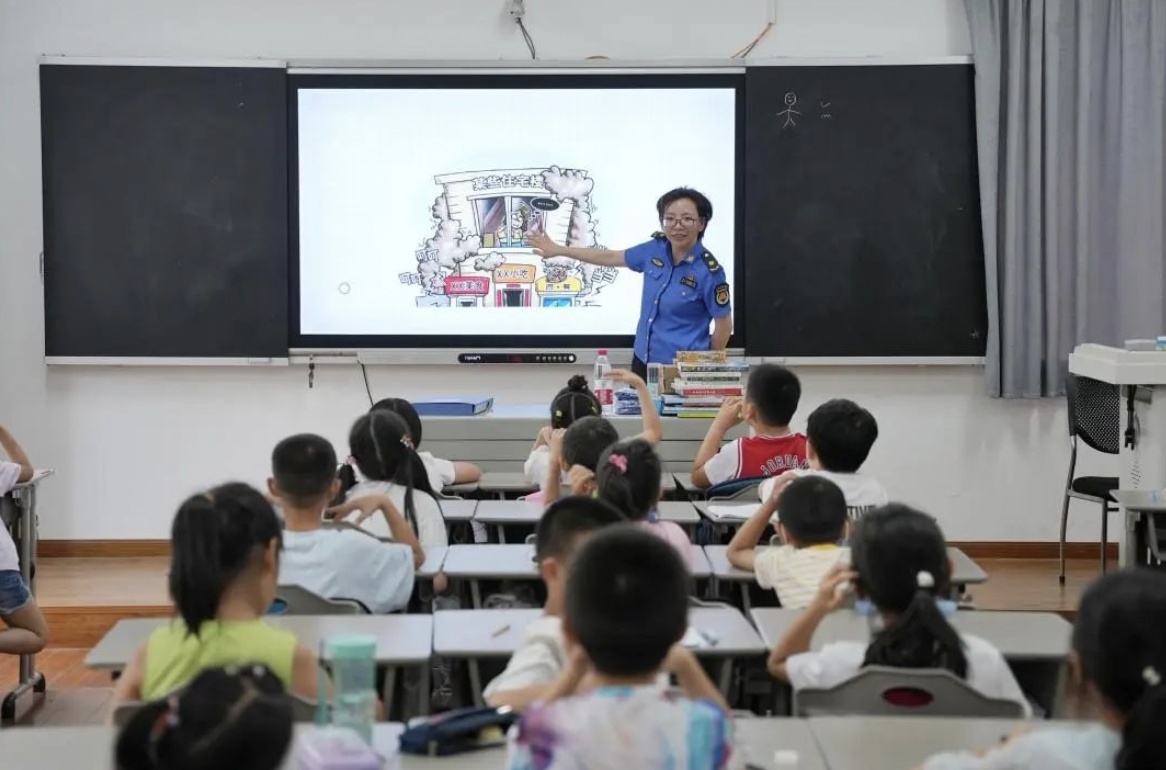 西渡街道第一期爱心暑托班的所有课程都经过精心设计,冰壶课源于国际冰壶日,既让孩子们了解冰壶这项运动,又能够亲身体验,留下深刻印象。不仅如此,7月15日是第8个上海城管“公众开放日”,暑托班就邀请了西渡街道城管中队的执法队员,带来了一节“小手牵大手共建美丽家园”的城管知识课,和孩子们讲讲城管都做些什么,在什么情况下小朋友可以去求助城管叔叔阿姨。课堂上,同学们踊跃举手发言,参与气氛高涨。