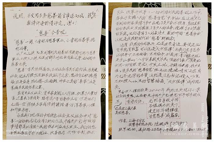 上海慈善网讯 2022年7月,上海市慈善基金会长宁区代表处启动了第六届“慈善箴言”征集评选活动。在众多的投稿中,长宁代表处收到了一位97岁老先生的手写信,他是来自长宁区安馨养老院五院的陆毓舜老先生。陆老在信中写了一篇题为《“慈善”今昔观》的文章,阐述了他对“慈善”的理解和对祖国的深厚情感。