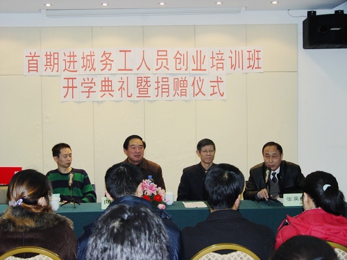 2006年12月27日晚上6:00,由上海市慈善教育培训中心主办,上海市长宁科技进修学院协办的“首期进城务工人员创业培训班开学典礼暨捐赠仪式”在瑞泰酒店一楼会议室隆重举行,从江苏、安徽、江西、福建、浙江、广东、吉林、黑龙江、湖南、山西、湖北、重庆、陕西、河南、山东、四川、贵州18个省和直辖市来沪谋生的48位进城务工人员参加了开学典礼。上海市慈善基金会理事、上海市慈善教育培训中心主任陈林,上海市长宁科技进修学院院长张英民,上海市慈善教育培训中心副主任徐本亮出席了开学典礼。