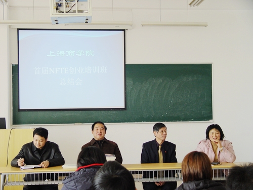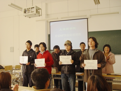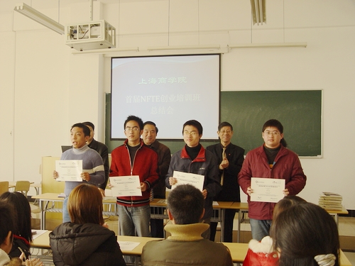 在上海商学院两级领导班子对青年创业型就业的高度重视下,“中心”举办的NFET创业培训2006年9月21日走进了上海商学院。经过浓缩精华的创业理念和创业知识的传授,面对面地和创业者进行交流,举行销售实践活动,编制商业计划书,来自上海商学院下属的财会金融学院、计算机学院、国际交流学院、新闻与传播学院、财会金融学院、艺术设计学院、法政系公关国际交流学院等学习国际经济贸易、连锁经营管理、新闻、财务管理、物流管理、电子商务、会展等专业的53位学生,表现出了极强的求知和创业愿望,全部取得了合格证书。经过培训后,40%的学员有了强烈的创业愿望,58%学员比没有参加培训前增添了不少创业动力和元素。经评委评议,李治强的骨碌甜品店,史宁娟的洁馨花卉有限责任公司,舒懿的星座咖啡主题咖啡屋,王春慧的新元素果蔬吧(营养家园)、王寒的新火书店和赵诣的铁血军迷店获得了优秀商业计划书;黄笛的飘香快餐店、刘晶的牛津会展人才专业培训有限公司、孙靖嫕的心怡婚礼策划公司、吴倩的安心乐家、尤美钱的水果蓝子、赵彦鑫的WAIT侯妻吧获得了表扬商业计划书。