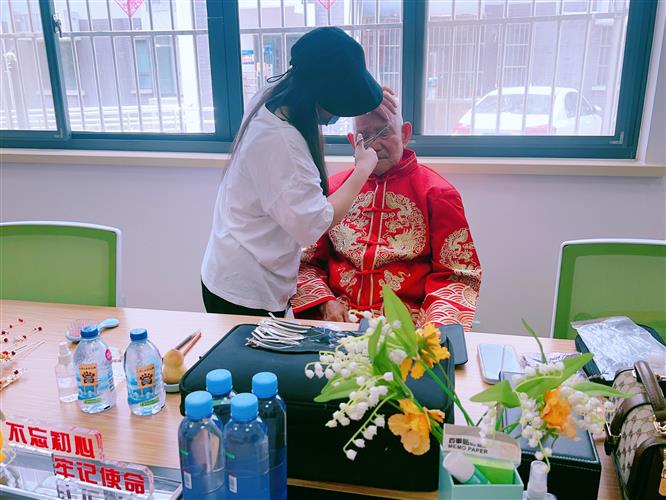 在拍摄过程中,乐耆社工全程陪护金婚长者们精心挑选服装,并由专业化妆师化妆、做造型。老人们换装打扮后,个个神采奕奕,眼中泛着光芒,好像又回到那个妙龄少女和翩翩少年的年代。
