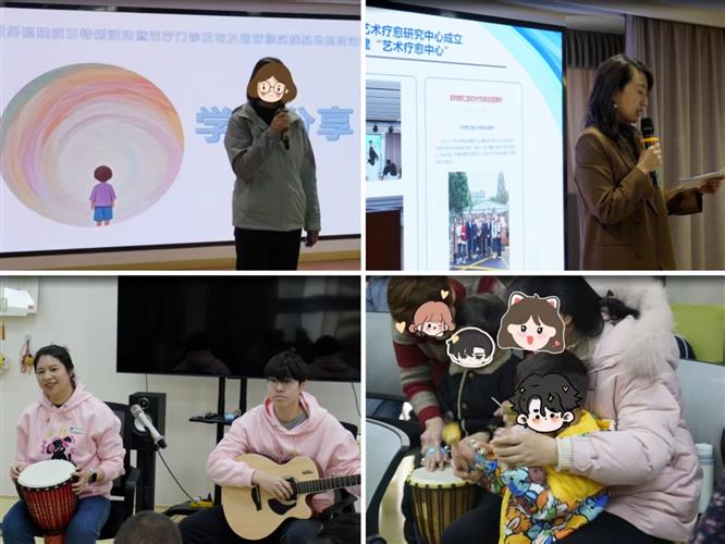疗愈班学员家长现场分享孩子成长蜕变,讲述孩子通过绘画、音乐打开心扉的故事。专家介绍非语言表达在在自闭症干预中的成效,及艺术疗愈的重要意义。随后,孩子们在专业老师的悉心引导下,借助非洲鼓等乐器,沉浸式体验打击乐带来的独特疗愈。