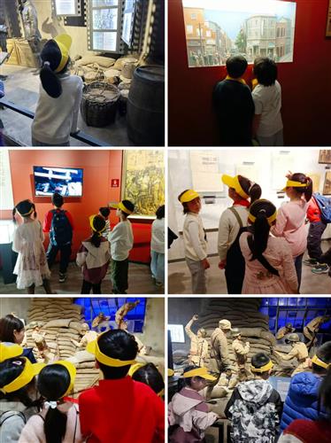 活动当日,孩子们怀揣着期待与敬仰的心情,踏入四行仓库抗战纪念馆。馆内陈列的历史文物、详实的图片资料,以及高度还原的战争场景,生动再现了 80 多年前那段惊心动魄的战斗岁月。孩子们仿佛穿越时空,亲眼见证了谢晋元团长率领“八百壮士”,坚守四行仓库,与日军浴血奋战的壮烈场景。