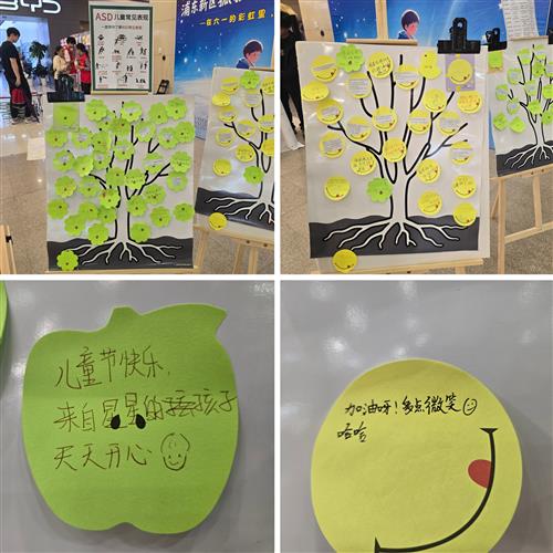 在“树洞心声”留言区,一面树墙被孩子们满满的祝福所覆盖。小朋友们用稚嫩的笔迹写下:“那你乖点,老师会喜欢你的”“祝你天天开心不要哭”“DON'T GIVE UP!”等温暖话语。大朋友们则留下:“太阳、星星、彩虹看世界,拥抱色彩,加油,世界有你有色彩”这样充满力量的鼓励。每一句质朴的言语,都饱含着对“星星的孩子”最温暖的接纳。