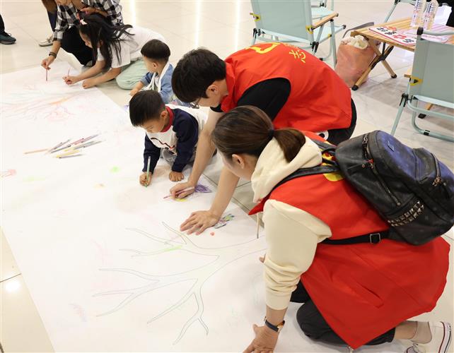 在浦东精卫中心艺术疗愈团队俞老师的现场指导下,“绘画融合”环节成为了孩子与家长互动的精彩时刻。普通孩子在孤独症孩子创作的20米画布长卷上继续挥动画笔,前者用独特的笔触勾勒内心世界,后者用缤纷色彩回应。随着画笔的舞动,一幅幅充满想象力的画面逐渐呈现,最终交织成一幅充满生命力的“星空画卷”。俞老师感慨道:“当画布被填满时,就是孩子们送给世界最好的礼物。”活动现场,她还为家长提供一对一咨询,耐心解答干预过程中的困惑,为家长们点亮了一盏盏希望之灯。