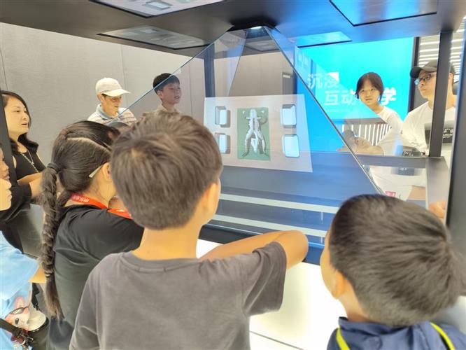 走到机械臂展台,孩子们又被“会自己干活的手臂”深深吸引。“是有人在遥控吗?”一个孩子踮起脚尖张望着问,导览员指向屏幕里的化工厂画面解释道:“它是按程序工作的,能帮人捡拾有毒废料,避开危险。”当戴上AI虚拟眼镜的那一刻,孩子们愈发兴奋——镜片里跳出检修提示,一个男孩一边模仿操作动作一边说道:“这就像玩游戏一样!”