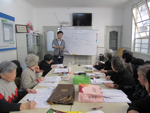 据了解,英语小组组长、负责人张明敏老师热心社区公益,她深刻了解很多老人渴望紧跟时代步伐的不服老心态,和副组长陈老师一起负责成立了这个英语学习小组。张老师为人慷慨,真诚大方,具备一定英语基础的她不仅经常自掏腰包为老人们印制各种学习辅导材料,并对各种疑难问题有问必答,还会在每年圣诞节来临之时在社区公益站举办英语联欢会,鼓励大家积极参与,在了解异国风俗的同时进一步激发学习的热情。去年,借着上海世博会的东风,成员们通过英语学习了解了不少世界文化知识,开阔了眼界。英语小组年轻的授课老师们都来自本街道各政府部门和事业单位,他们中大多数是青春活力的“80后”,大家协调工作,利用业余时间担当社区志愿者英语老师。针对老年人接受能力、记忆力比较差的特点,“80后”的老师们授课通俗易懂,生动简洁,并会在中途休息时间和老人们谈天说地,用年轻的思维和时尚的目光感染老人们,带给他们温暖和愉悦。笔者来到雁荡公益站的当天下午,正有来自商委的青年公务员小李在认真授课,课堂里充满了欢声笑语。老人们说,学习英语是一种寻找晚年快乐的方式,可以保持思维活跃和心态年轻。和年轻人多多交流,可以紧跟时代,了解国内外各类新闻,非常需要。确实,夕阳岁月的乐趣需要寻找。真诚的祝福雁荡社区公益站英语小组的老人们幸福安康。