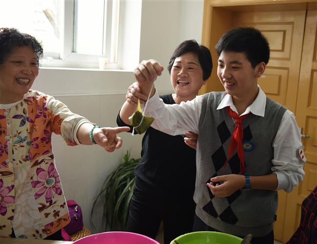 老人与孩子一起包粽子