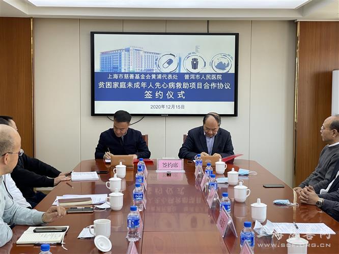 12月15日上午,上海市慈善基金会黄浦区代表处与普洱市人民医院对贫困家庭未成年人先心病救助项目合作协议签约仪式,在普洱市人民医院行政楼会议室举行。“爱‘心’行动--贫困先心病儿童救助项目”于2020年—2022年在云南省普洱市,为具有手术适应症的贫困家庭先心病儿童进行免费手术,计划每年为20位当地贫困患儿实施免费手术,每年项目费用50万。今年的手术费用将由此次前往考察的四家爱心企业集团通过上海市慈善基金会黄浦区代表处进行全额资助。