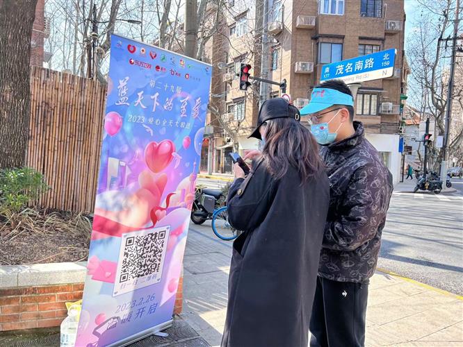 2月26日上午9时,上海市慈善基金会黄浦区代表处联合上海市黄浦区精神文明建设委员会办公室,组织瑞金二路街道18名爱心志愿者,分3个时段在南昌路茂名南路口朗读亭设立爱心打卡点,向市民宣传慈善理念,并帮助路人通过扫描活动二维码,完成爱心打卡活动相关小任务,获取慈善数字藏品。