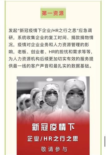 疫情爆发之初,上海韧力投资管理有限公司(第一资源)董事长刘红个人及公司向上海慈善基金会共捐款5000元。同时,第一资源还发起了《新冠疫情下企业/HR之行之思》应急调研。系统收集部分客户企业的复工时间、捐款捐物情况,以及疫情对企业业务和人力资源管理的影响等,为人力资源机构后续更加切实有效的服务,提供了最一线的客户声音和最扎实的数据基础,也为相关部门及时聆听到企业前沿的声音提供决策参考。调研发出后在短短48小时内陆续收到了近百家企业主/HR的回复。
