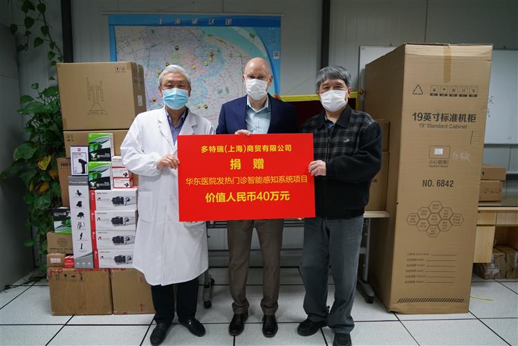 捐赠仪式在华东医院举行。上海市慈善基金会静安区代表机构会长刘晓明、华东医院院长高文和多特瑞(上海)商贸有限公司总裁麦欧文等参加了捐赠仪式。