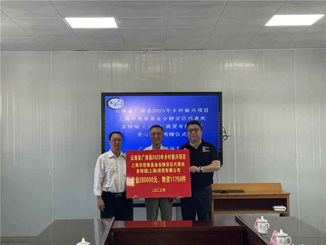本次考察团成员——多特瑞携手关爱基金为助力广南县乡村振兴工作,向广南县民族职业高级中学捐赠双肩包6750个、洗手液5000套(另配捐资金8万元),捐赠20万元用于资助当地大重病患儿困难家庭。