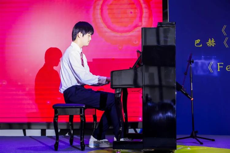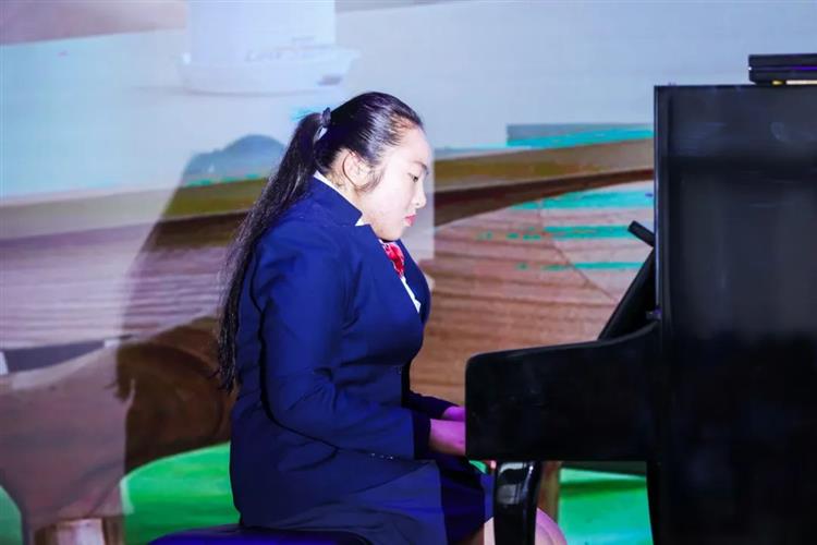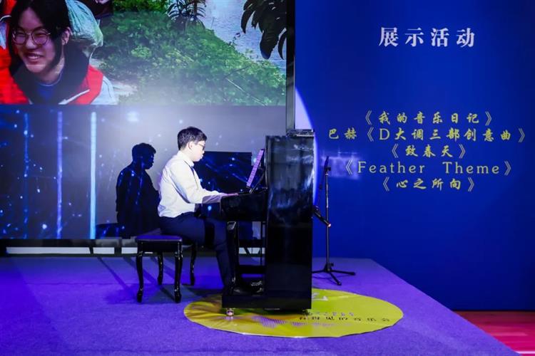 沈子衿同学患有耳疾却依然坚强、勇敢、热爱音乐,她在逆境中奋起,在钢琴演奏路上追光前行。在AI可视化音符动画的映衬下,李博文同学、何子豪同学用琴声演绎春天的魅力与模范生的力量。