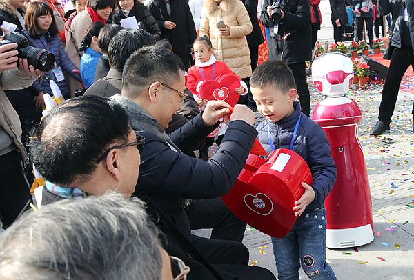 活动现场,两个智能机器人和4个可爱的孩子来到会场中心进行劝募了,与会嘉宾纷纷拿出手机对着机器人扫描二维码捐赠,还有的纷纷把爱心善款投入募捐箱。