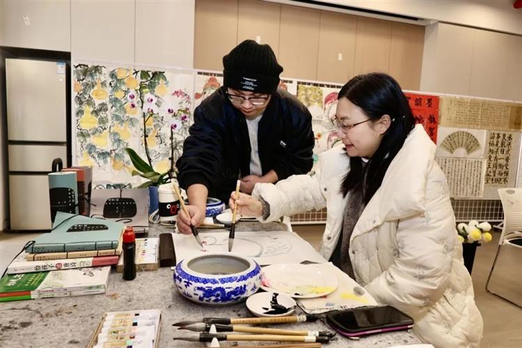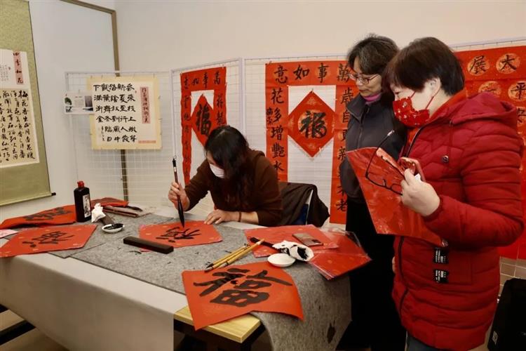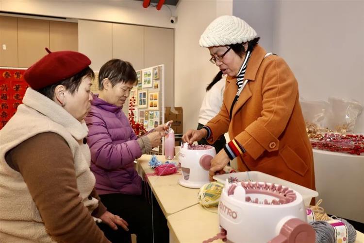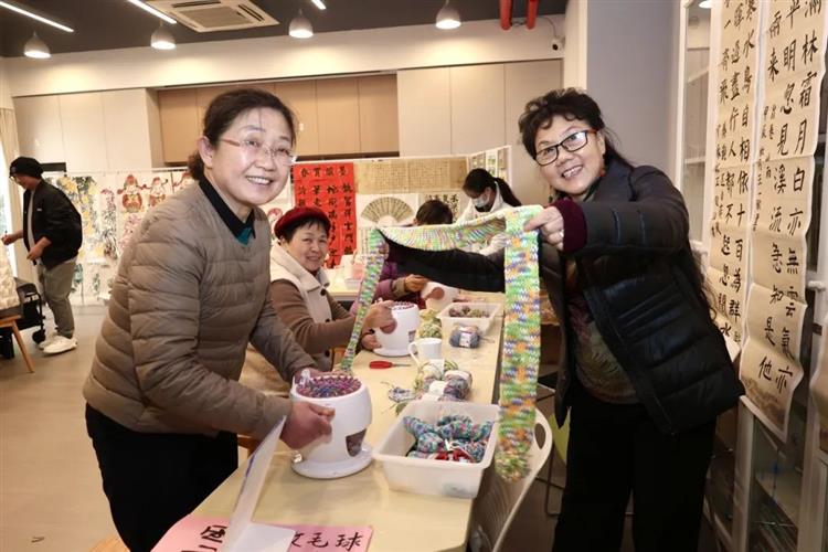 集市上,设立了各种各样的摊位,书法、绘画、编织、花艺、手工……四周还展示了居民们的绘画作品和书法作品。在集市现场,人们可以写福字,画红包,还可以用手摇式的编织机,快速织出一条好看的围巾。居民们只要感兴趣,都可以上去一展长才。