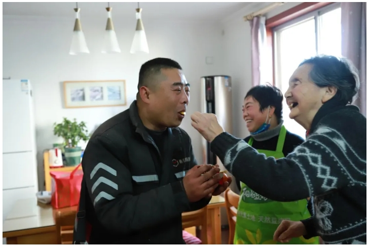 在上海市慈善基金会长宁区代表处的安排下,徐新宇在内的多名小哥为辖区内的“三老”家庭送去了暖心年夜饭,同时也收获了他们的新年祝福。“我们能够享受便利的生活,离不开你们的辛勤付出,这座城市因你们的存在而变得更有温度。”年过耄耋的独居老人雷建华是“两弹一星”工程的亲历者,在收到年夜饭后,她激动地拉着徐新宇的手,表示自己虽然行动不便,但是在社区和各界爱心人士的关心下,生活中遇到的各种困难都变得微不足道。虽然已经年近九旬,但平时在身体状况好的情况下雷建华还会为寒暑假的小朋友们讲课,“只要社区需要我,我也将尽自己所能为社区做点事情。”