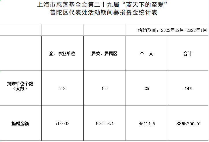 普陀区第二十九届“蓝天下的至爱”慈善募捐活动在社会各界热心慈善公益的企事业单位、社会团体、社区居民和爱心人士的大力支持下,目前已圆满结束。活动期间,上海市慈善基金会普陀区代表处收到全区258家爱心企业、单位、社会团体,160个居委、居民区,以及26名个人为普陀区慈善事业奉献的爱心,本次活动共募集善款886.57万元。