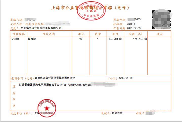 7月3日,上海市慈善基金会普陀区代表处通过新的开票系统,为中船第九设计研究院工程有限公司开具了普陀区的第一张电子票据和电子捐赠证书。