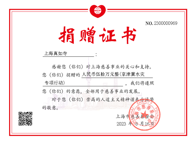 8月16日,上海真如寺向普陀区代表处捐赠50万元善款,定向用于“驰援京津冀等地区水灾”专项行动。上海真如寺长期关注普陀区慈善事业,多年在普陀区“蓝天下的至爱”慈善活动中积极捐赠,所捐款项全部用于普陀区各类困难人群的慈善救助和公益事业.