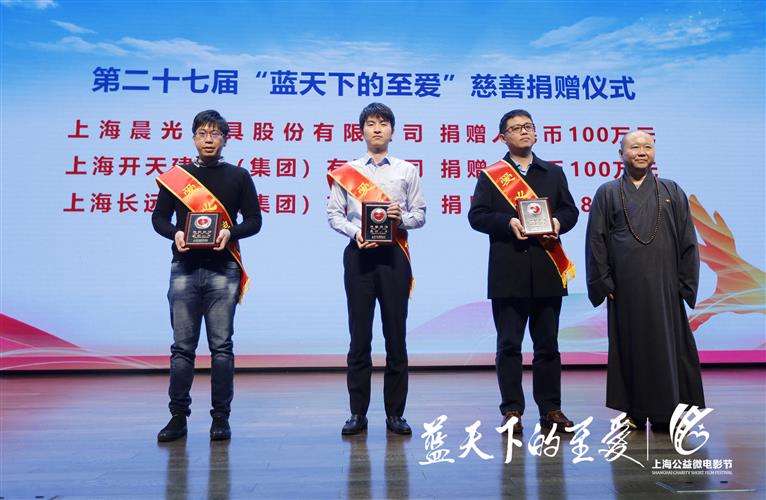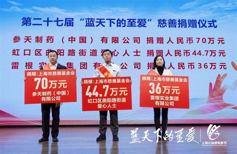 上海慈善网讯 12月19日下午,第二十七届“蓝天下的至爱”慈善活动开幕式暨第六届“上海公益微电影节”颁奖典礼在上海世博博物馆举行。虹口两家企业及爱心人士(上海长远文化集团有限公司、上海雷根实业集团有限公司、虹口区曲阳路街道爱心代表)参与了捐赠仪式,分别捐赠了85万元、36万元、44.7万元的爱心善款,用实际行动在这个寒冬温暖着人心,彰显虹口慈善力量。