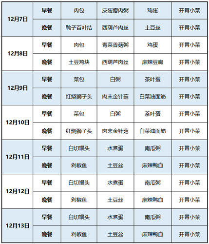 2020年12月7日—2020年12月13日,早餐06:00,晚餐17:30。