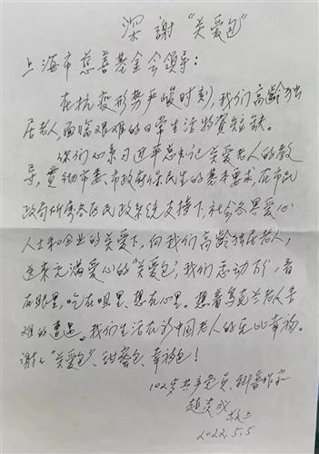 “在疫情期间高龄独居老人面临日常物资短缺的时刻,能够收到上海市慈善基金会发放的‘关爱包’,心里感动万分,你们送来的‘关爱包’就是我们老人们的‘甜蜜包’、‘幸福包’。”102岁的共产党员赵炎成是一位科普作家,在收到上海市慈善基金会发放的社区高龄独居老人“防疫生活关爱包”后,特意亲笔写下感谢信,诠释了浓浓抗疫情。