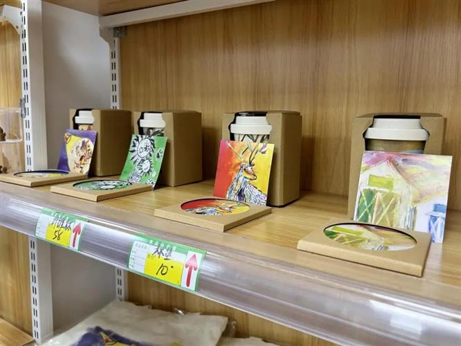 22岁的小戴是当天的“星管家”之一。“现在我来为大家介绍一下这些商品。我会吹小号,也会画画,这个杯子上就是我的画,上面是一个女孩,她的头发是由花花草草组成的……”在超市靠近门口的左手边架子上,摆放着“星宝”们创作的各类文创作品,还有小卡片介绍这些“星宝”的故事:记忆力超群的聪聪,喜欢把各国国旗画进一幅画里;轩轩喜欢边画画边问问题,他的每幅画都充满了故事;清源的语言表达比较困难,唯一能让他专注下来的就是画画……没过多久,在小戴的“大力推销”下,“星宝”们创作的杯子就成功售出两个。收银台前,“星管家”龙龙在康复师和家长志愿者的协助下,登记了销售记录,并指引顾客扫码支付,“谢谢惠顾,下次再来”!