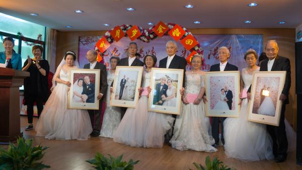 在主会场,来自本社区的5对金婚夫妇身着婚纱西服闪亮登场,展示了健康老人的靓丽风采。金婚老人代表朱彩娣阿姨与大家分享了和老伴相濡以沫、甘苦与共的人生故事。老协会共建单位蔚蓝海岸婚纱摄影公司向金婚老人赠送提前拍摄的金婚纪念照和光盘,圆了老人们的婚纱梦,也深深打动了每一位观众。