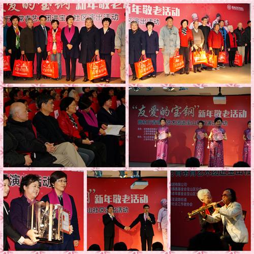 上海慈善网讯 12月23日下午,“友爱的宝钢”2015新年敬老活动暨柏万青常青艺术团进宝山社区演出活动,在友谊路街道市民中心举行。宝钢集团有限公司向市老年基金会宝山区分会捐赠30万元善款,专项用于2015新年迎春敬老慰问活动,并向宝山区1000名困难老人发放新年慰问品。