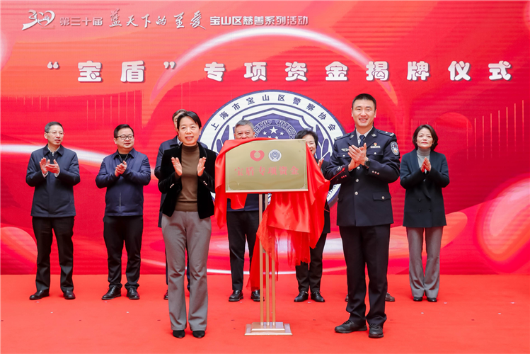 副区长薛飒飒、唐凌峰为“宝盾”专项资金揭牌。由宝山警察协会牵头,宝钢股份及爱心企业捐赠,借助社会资源积极开展和助推上海市公安局宝山分局民警、辅警公益活动。