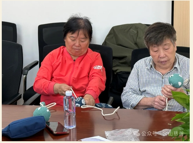 社工把制作材料逐一分发给大家,紧接又向大家普及了艾草锤的功效和作用,“制作好的养生锤会散发着淡淡的艾草药香,有宁神理气、安神助眠、驱蚊驱虫的作用。用它轻轻敲打在身体的各个部位,可以疏通经络,加快人体的血液循环。”听完介绍后,大家在社工的指导下,先将准备好的材料装进无纺布袋里,再用充满民族风的彩布平摊在桌面、无纺布袋用彩布包裹,正中间捏成一个紧实的圆形......最后再用五颜六色的麻绳紧密缠绕手持棒……看似简单的养生捶在绕手持棒时确实有些难度,需要两个人的配合。活动现场大家自发合作,俩俩搭档,相互帮忙,一个拽着养生捶,一个拉着麻绳,配合着将麻绳紧紧地绕在手持棒上。