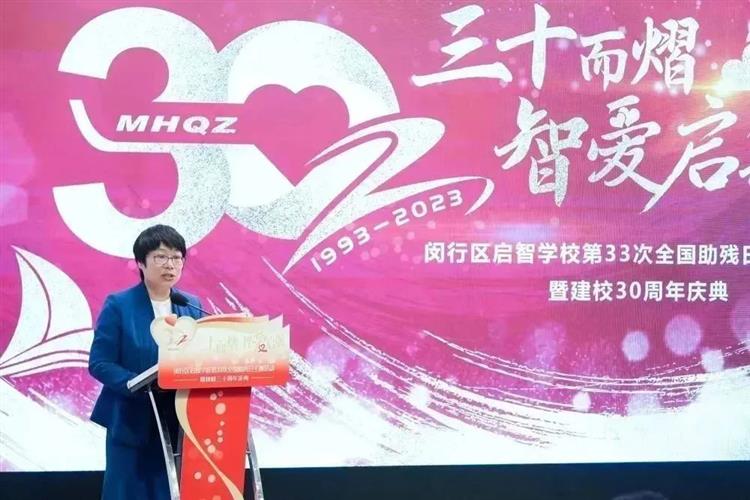 闵行区教育党工委书记恽敏霞上台讲话。她感谢社会各界人士对特殊教育的关爱、支持,同时对学校提出了三点希望:希望启智学校不要辜负各级领导和社会各界的关心援助和殷切期望,再接再厉,求实创新,不断提高管理水平和教学质量;同时希望老师们要进一步增强责任感,兢兢业业,全身心投入到特教工作中;最后希望孩子们要牢固树立起生活和学习的坚定信心和决心,自立自强,乐观向上。