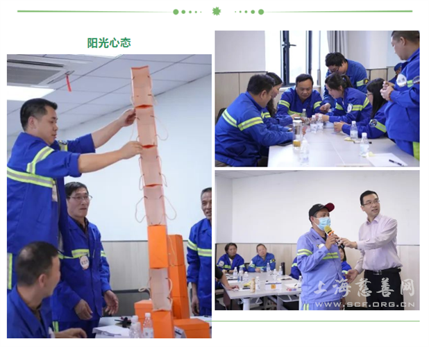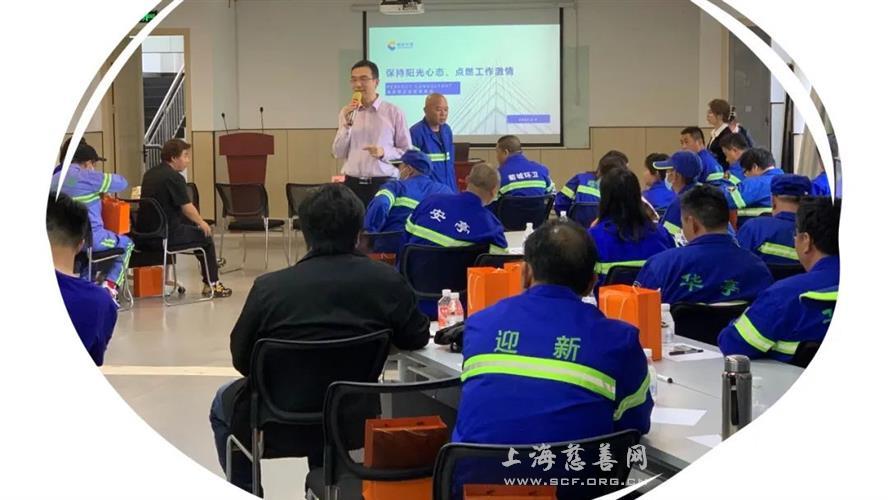 为感谢环卫工人们为美化城市作出的贡献,上海市慈善基金会嘉定区代表处联合上海嘉定城发环境服务有限公司于2023年5月9日下午,在上海国际汽车城人才培训学院为部分一线员工开展了“微光成炬·爱暖相随”系列活动之——“保持阳光心态、点燃工作激情”调节解压培训。