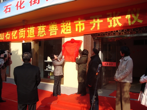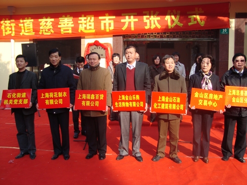 金山区人民政府副区长李华桂和区民政局局长王伟芳为慈善超市揭牌,市慈善基金会副秘书长叶国恩、石化街道主任顾志雄分别做了讲话。