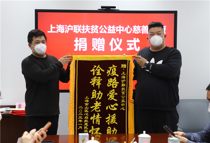 区民政局副局长吴丽梅代表金山区民政局、养老机构向沪联扶贫公益中心赠送锦旗表示感谢。