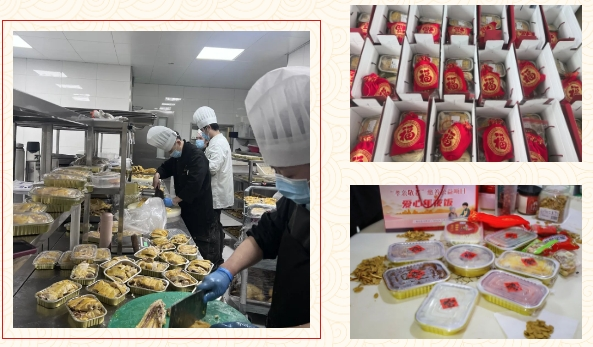 本次“爱心年夜饭”得到上海广缘大酒店和东林寺的全力支持。为使年夜饭更加贴心、更具特色,一方面金山慈善联合广缘大酒店对菜单进行了多次调研与修改,最终确定6菜1汤和1份吉祥干果、1份东林寺长寿面;另一方面金山慈善定制了一批“福”字挂件,作为年夜饭的配套礼品,既丰富了菜品的种类,又彰显了对老人们的深情厚意与独特关怀,祝愿他们在新年之际感受到满满的福气与温暖。