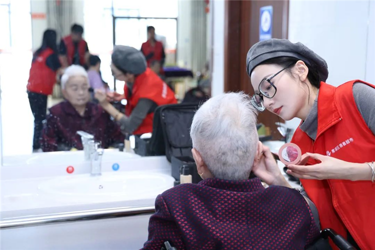 化妆间内,化妆师正在给老人们勾眉描唇,认真为他们打扮。虽然两鬓已斑白,但换上婚庆礼服,画上精致的妆容,老人们仿佛又回到了青春时代。拍摄现场,老人们在摄影师的指导下,摆出不同的姿势,随着一个个甜蜜温馨的笑容在镜头里定格,一张张迟到多年的“婚纱照”让老人们重新浪漫了一回。