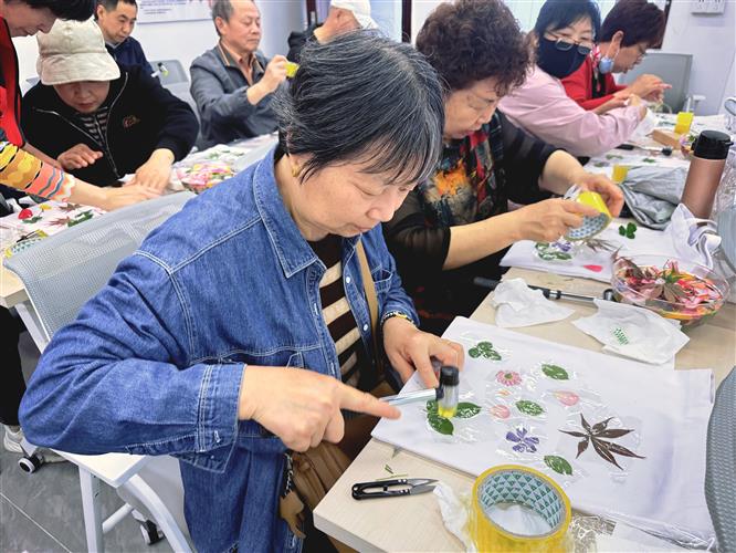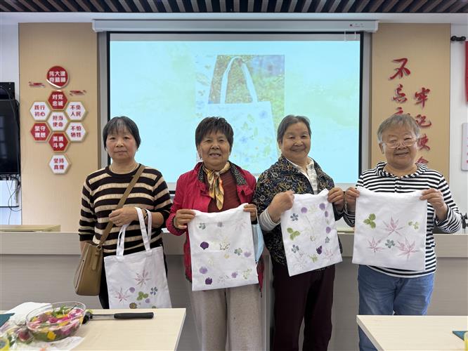 三元河社区开展植物拓染环保袋活动,老人们用树叶、花瓣创作独一无二的布袋,64岁的王阿姨自豪地说:“以后买菜就用自己做的环保袋!”活动既弘扬传统工艺,也激发老年群体参与可持续发展的热情。