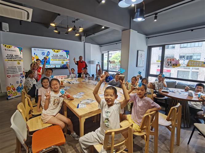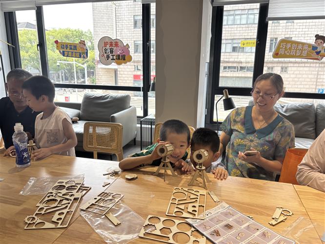 二楼“益启来”青少年活动区则变成了暑期家庭的热门打卡地。非遗美育课堂上,孩子们在老师指导下体验着漆扇制作、立体画绘制等传统艺术;创客手工课,小朋友们专注地拼装着望远镜、扫地机器人,在实践中培养创造力和动手能力;亲子互动区则成为了家庭周末的好去处,父母和孩子一起做文具盒,在协作中增进感情。“孩子在这里不仅玩得开心,还学到了很多课外知识,我们家长也能参与其中,这种亲子时光特别珍贵”一位年轻妈妈这样评价。“孙子在二楼学手工,我在一楼做活动,两全其美!”王阿姨的点赞道出了慈善超市的设计巧思——通过分层服务满足“一老一小”需求,让家庭代际互动更紧密。