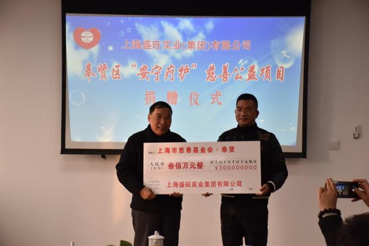 上海慈善网讯 2月2日下午,奉贤区举行“安宁疗护”慈善公益项目捐赠仪式。上海盛旺实业集团有限公司向上海市慈善基金会·奉贤捐款人民币300万元,定向用于“奉贤区中心医院安宁疗护病区”建设。